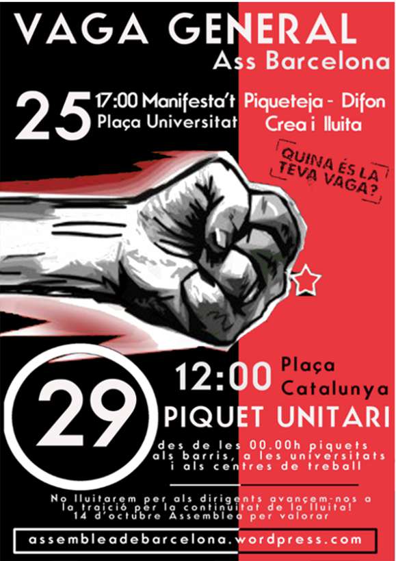 Des de la coordinadora d'individus, col·lectius, centres socials i espais autònoms dels barris de Sants, Poble Nou, Poble Sec, Sant Antoni, Clot, Barceloneta, Maresme… que venim participant en l’Assemblea de Barcelona hem desenvolupat la proposta de fer una manifestació abans de la vaga.