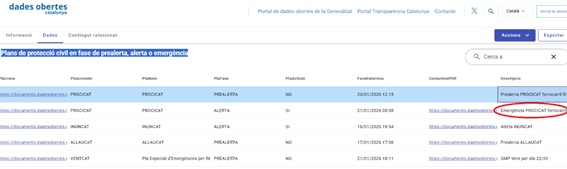 Dades obertes sobre Plans de Protecció Civil en fase de prealerta, alerta o emergència, on et pots baixar el comunicat oficial Plans de protecció civil en fase de prealerta, alerta o emergència | Dades obertes de Catalunya