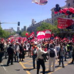 Després d'un breu refrigeri, es va marxar en manifestació fins al punt de la sortida de la mobilització organitzada per la cimera dels Pobles-Enllaçant Alternatives. Si bé aquesta en principi era una mobilització en contra dels objectius de la cimera Unió Europea-Llatinoamèrica i Carib i de la nefasta presidència europea del govern espanyol, s'ha transformat en una clamorosa protesta per les últimes mesures adoptades per José Luis Zapatero sobre la base del dictat del gran Capital, Estats Units i els països de ’primera’ europeus.