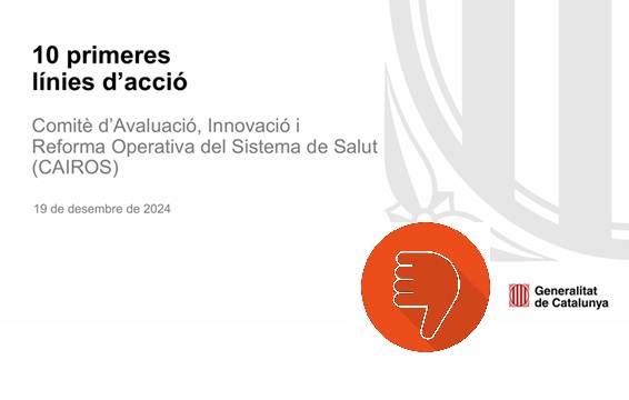 NOTA: en aquesta proposta denominada Cairos, la Consellera etiqueta a agents socials, pacients, professionals i ciutadania com a "barreres i resistències". I als pacients com a "clients". La ciutadania necessita una sanitat de gestió, provisió i titularitat 100% pública, i així s'ha de mantenir.