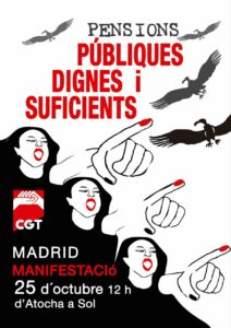 Les reivindicacions que plantegem des de CGT les tenim ratificades als nostres comicis interns, per això sortirem a defensar-les als carrers de Madrid i per tot arreu el proper 25 d'octubre, fem una crida a totes les persones treballadores, pensionistes i a tota la ciutadania a reclamar, defensar i fer sentir les nostres reivindicacions.