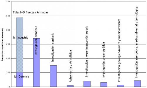 En la Figura 2 hem representat la despesa en I+D militar i algunes de les dotacions pressupostàries a investigació civil. Destaquem que, per exemple, la despesa pressupostada per a I+D militar és una vegada i mitja superior a la despesa pressupostada per al programa d'Investigació científica que inclou el finançament del CSIC (Consell Superior d'Investigacions Científiques), més de tres vegades superior a la dedicada a la investigació sanitària, 37 vegades superior a la investigació geològico-mineral i mediambiental i més de 50 vegades superior a la dedicada a la d'Astronomia i Astrofísica.